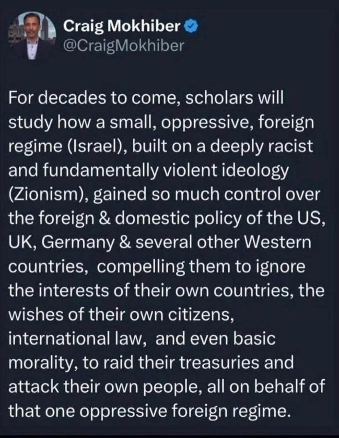 “For decades to come, scholars will study how a small, oppressive, foreign regime (Israel), built on a deeply racist and fundamentally violent ideology (Zionism), gained so much control over the foreign and domestic policy of the US, UK, Germany, and several other Western countries, compelling them to ignore the wishes of their own citizens, international law, and even basic morality, to raid their treasuries and attack their own people, all on behalf of that one oppressive foreign regime.” -Craig Mokhiber is the former United Nations Human Rights official and specialist in international human rights, policy, and methodology. He was the director of the New York office of the United Nations High Commissioner for Human Rights and resigned in protests of Israel’s Genocide of the Palestinian people stating the it was a “textbook case of Genocide.”