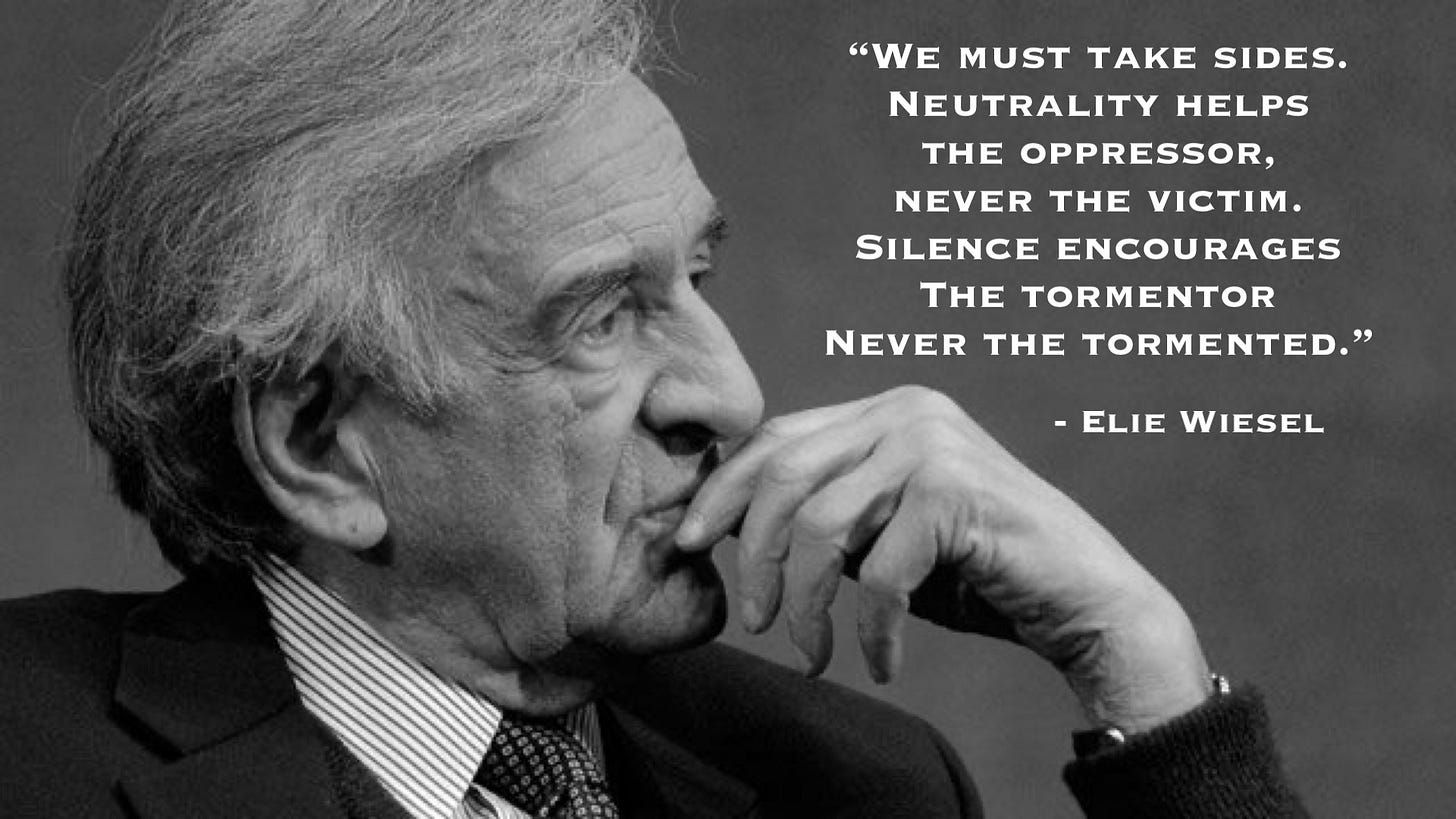 “We must take sides, neutrality helps the oppressor, never the victim. Silence encourages the tormentors, never the tormented.” -Elie Wiesel