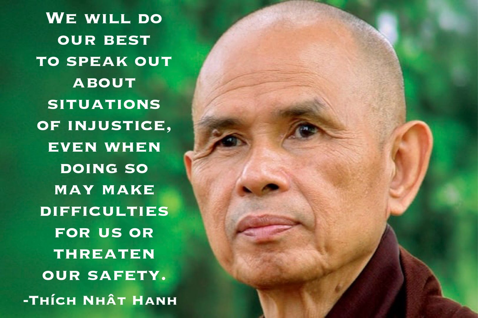 “We will do our best to speak out about situations of injustice, even when doing so may make difficulties for us or threaten our safety.” -Thích Nhât Hanh (from the 9th Mindfulness Training).